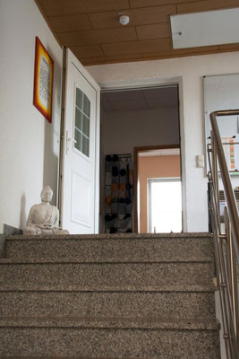 Der Eingang ist gut ausgeschildert. Die Yogaschule befindet sich im 1. Stock.